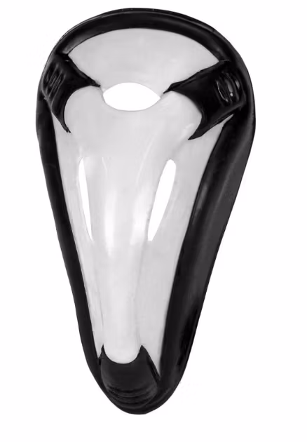 Skyddskupa av hårdplast skyddar det känsliga genitala området från skador.
