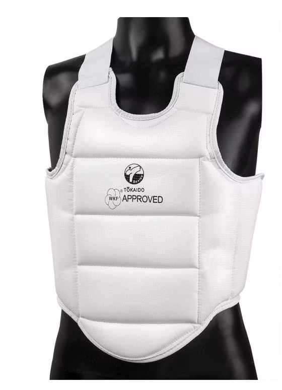 Lätt karateväst tillverkad av Tokaido speciellt för barn U14. Skyddar överkroppen på ett tillförlitligt sätt mot slag och sparkar under träning och tävlingar. Denna kroppsväst för barn är WKF-godkänd och kan användas vid WKF Youth League-tävlingar. Västen bärs OVER karate-gi:n.